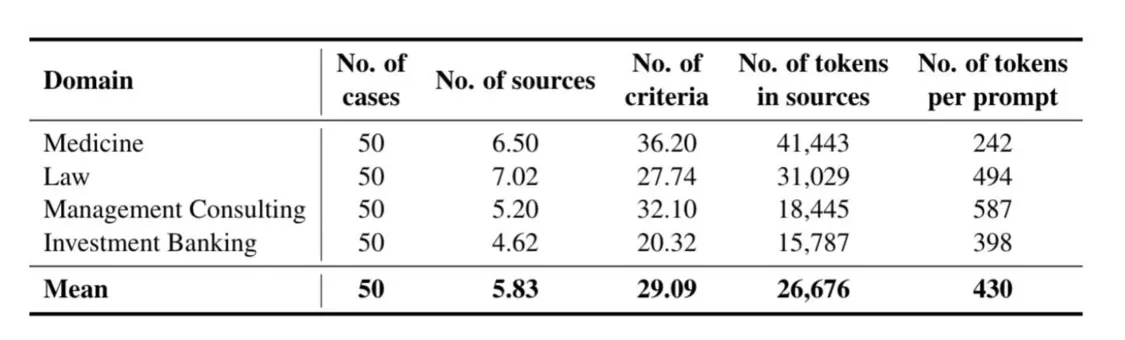 APEX v1.0由200個(gè)案例組成,平均分布在投資銀行、法律、咨詢和醫(yī)療中。每個(gè)案例都由提示(任務(wù)描述)、來源(完成任務(wù)所需的信息)和評分標(biāo)準(zhǔn)(對模型響應(yīng)進(jìn)行評分的標(biāo)準(zhǔn))組成。