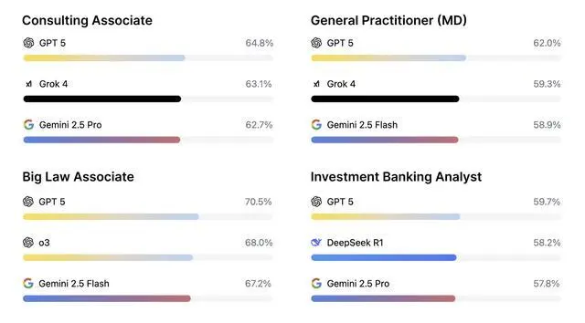 本月初,Mercor官宣了其首創(chuàng)的AI生產(chǎn)力指數(shù)(APEX),可以根據(jù)AI模型執(zhí)行具有經(jīng)濟(jì)價(jià)值的知識工作的能力來評估它們。 目前,APEX包含代表四個(gè)職業(yè)工作的任務(wù):投資銀行助理、大型法律助理、戰(zhàn)略咨詢助理和全科醫(yī)生(MD)。