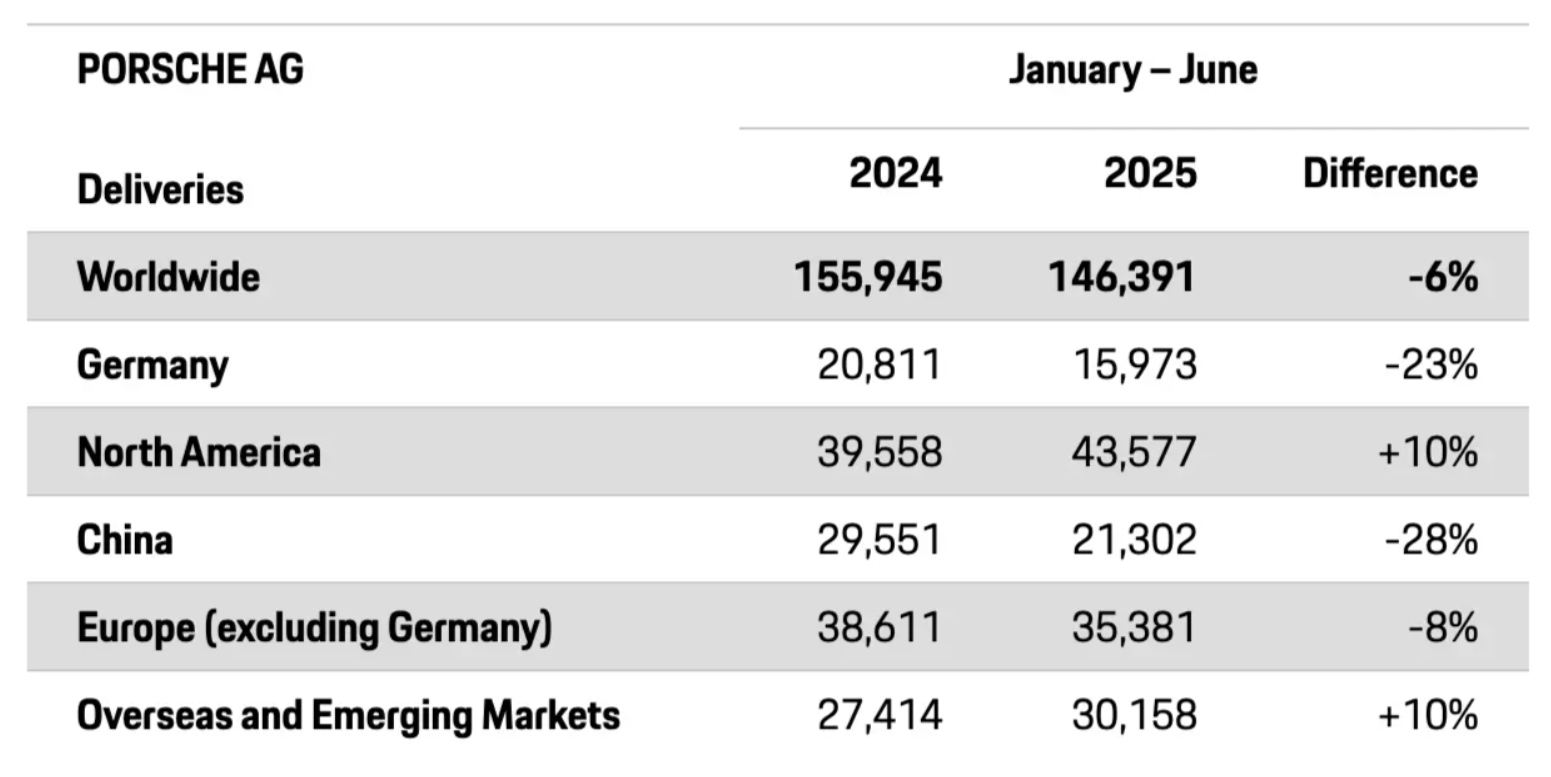 顯然,從保時(shí)捷官方發(fā)布的數(shù)據(jù)來(lái)看,2025年上半年,其在全球市場(chǎng)的整體銷量呈現(xiàn)出一定的下滑態(tài)勢(shì)。