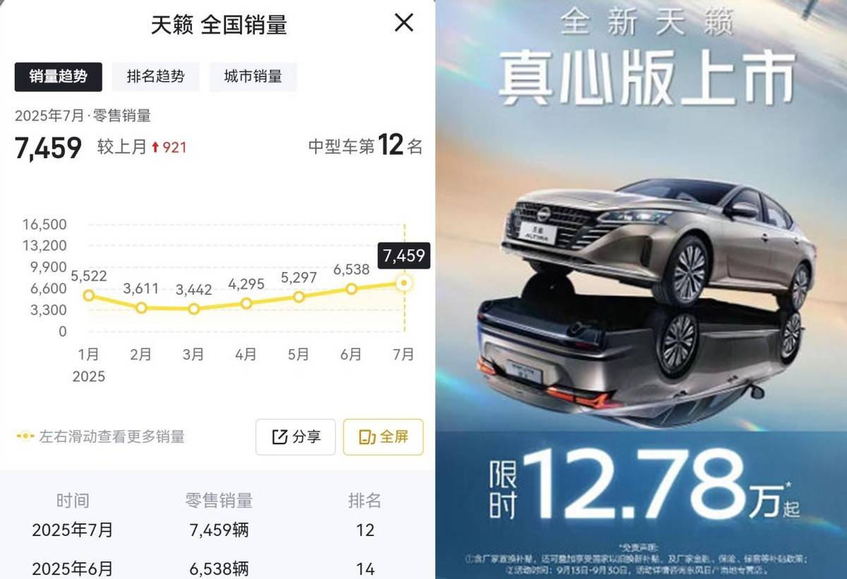 東風(fēng)日產(chǎn)天籟作為一款日系中型轎車,自從推出了售價12.78萬元的真心版車型后,其銷量便一路開始上漲。在今年3月份,它還僅只有3442輛新車的月銷量數(shù)據(jù)進賬,而在剛過去的7月,其便取得了7459輛新車的銷量成績單,由此可見,降價對天籟車系銷量的提升確實起到了決定性的作用。