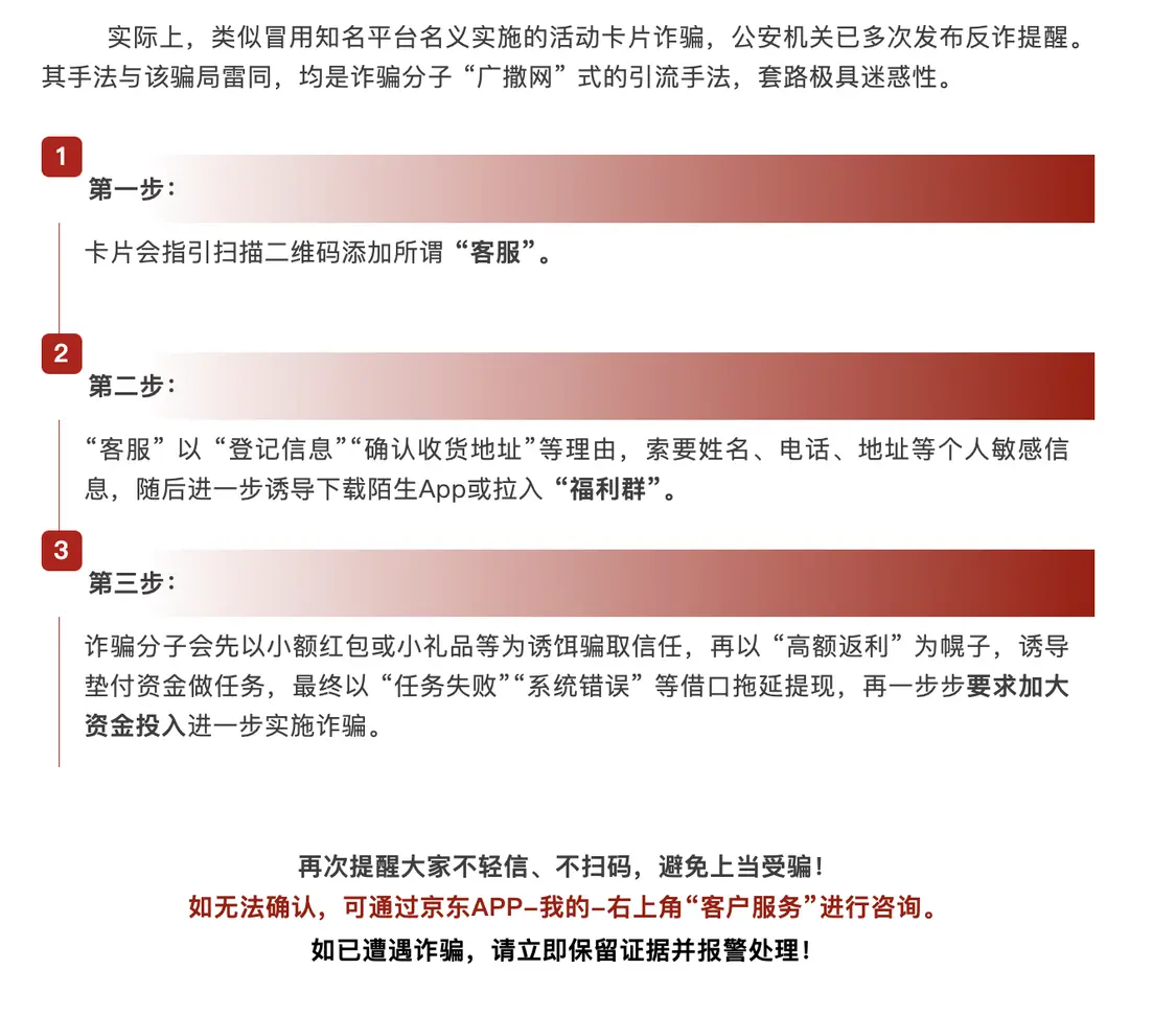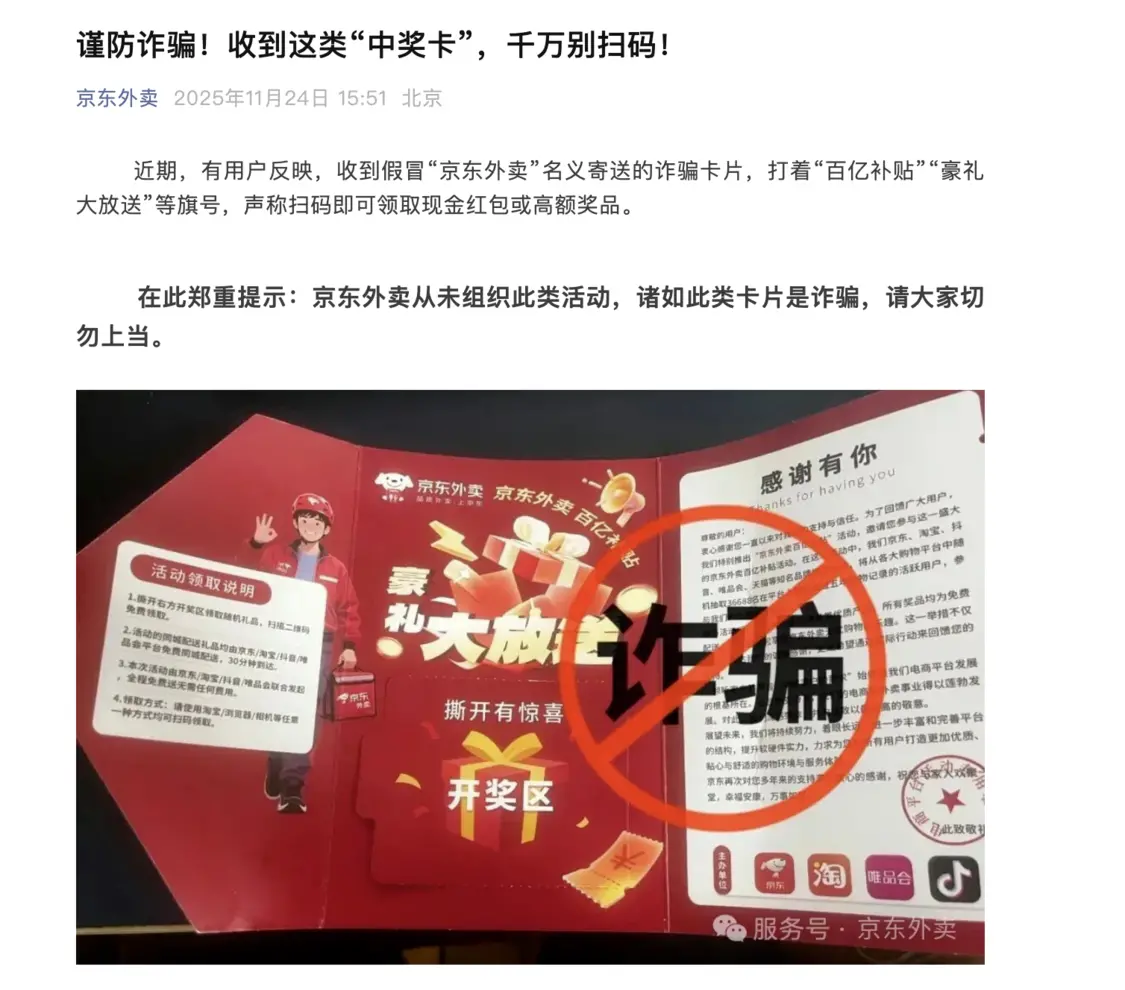 11月24日,京東外賣官方發文稱,近期有用戶反映,收到假冒“京東外賣”名義寄送的詐騙卡片,打著“百億補貼”“豪禮大放送”等旗號,聲稱掃碼即可領取現金紅包或高額獎品。官方鄭重提示:京東外賣從未組織此類活動,諸如此類卡片是詐騙,請大家切勿上當。
